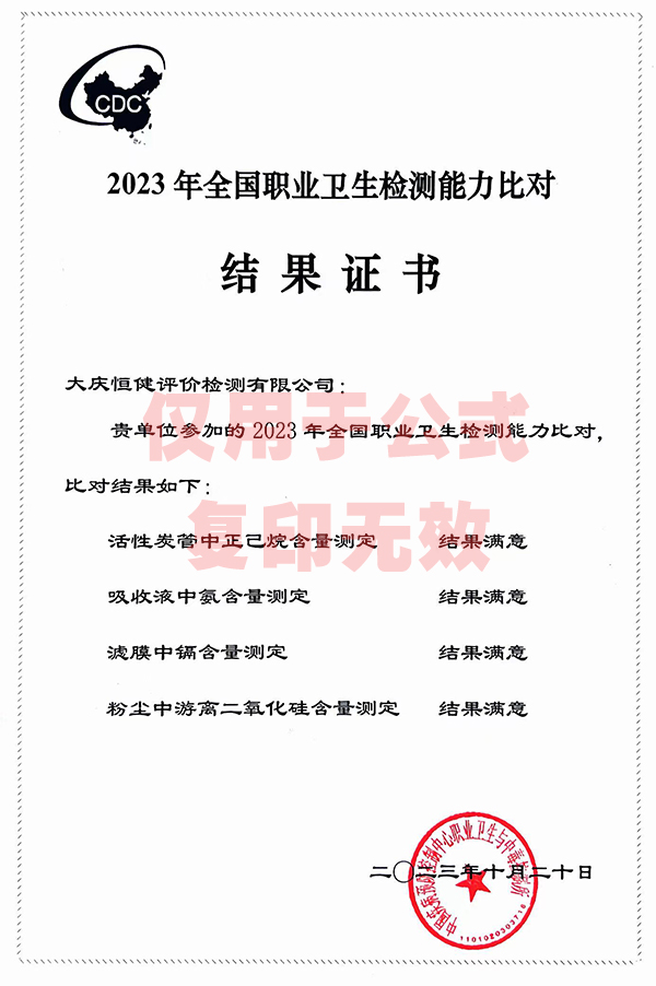 2023年全國職業(yè)衛(wèi)生檢測能力比對(duì)結(jié)果證書